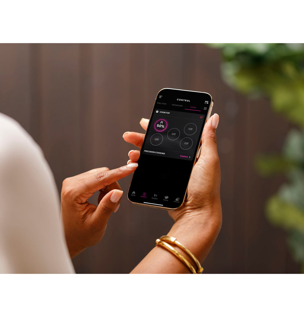 This smart cooktop features Built-In WiFi so you can monitor your burners and view power levels, precision temperature, or on/off.