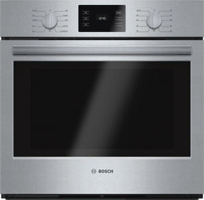 Bosch's HBL5451UC 30-inch Single Wall Oven, in stainless steel, features genuine European-style convection for incredibly even baking results on all levels. 11 specialty cook modes make gourmet dishes easy to create; custom cooking modes include pizza, pie, warm and proof. Plus, the EcoClean 2-hour self-clean cycle quickly deals with any accidental bubble overs and spills. Specifically designed to be installed flush with your cabinetry, this wall oven is compatible with most competitors' cutouts, making installation easy. To top it off, the heavy metal stainless steel knobs offer a premium European feel.